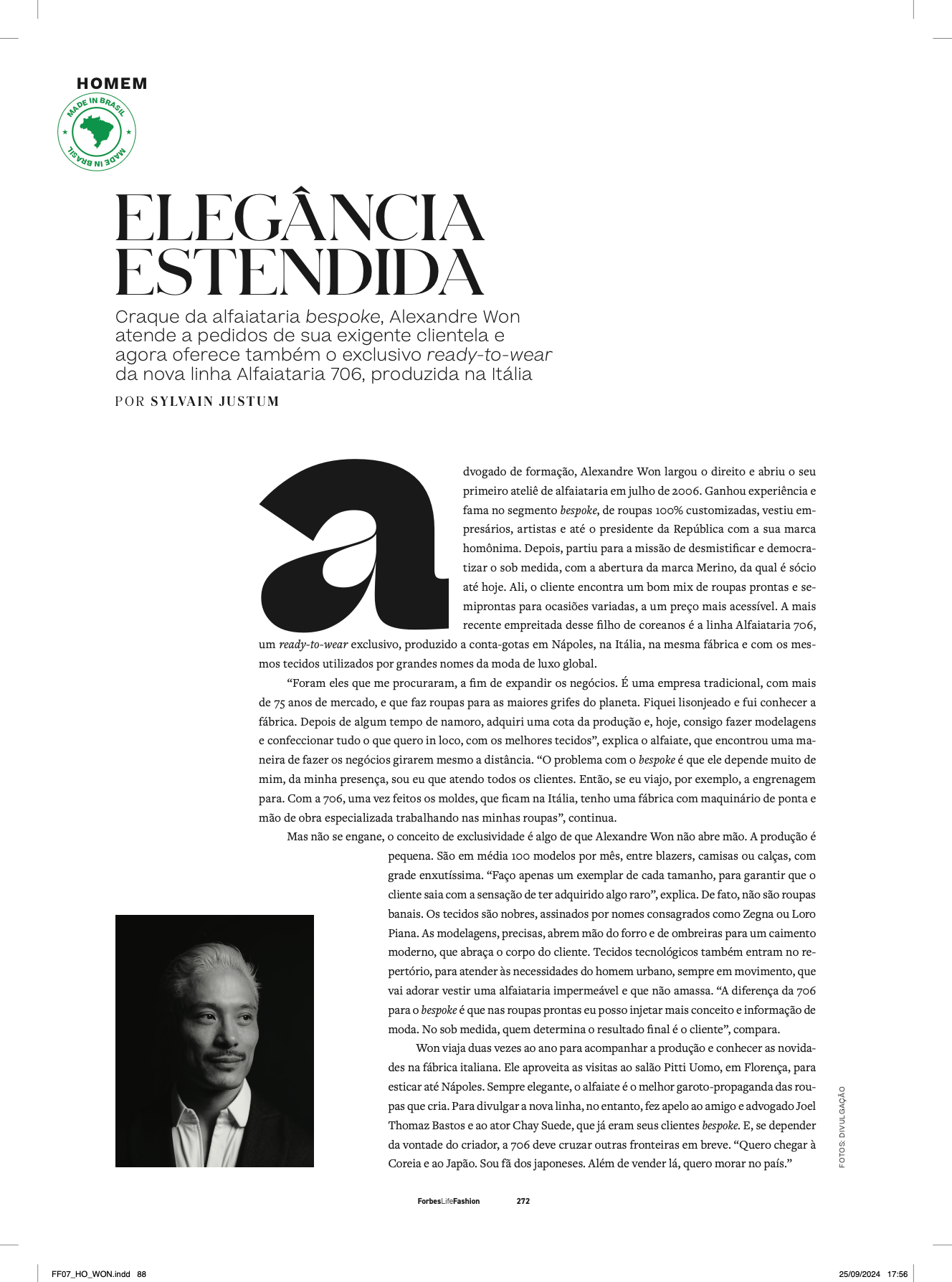 É dia de gravação de seu programa na Record e Roberto Justus chega a tempo de receber Alexandre Won em seu camarim. O casamento com a modelo Ana Paula Siebert está marcado para 30 de abril e será do alfaiate paulistano a assinatura do terno do noivo. “O Alexandre é detalhista, moderno e atual. Ele molda a roupa no corpo do cliente. Eu nunca tinha visto isso antes.
